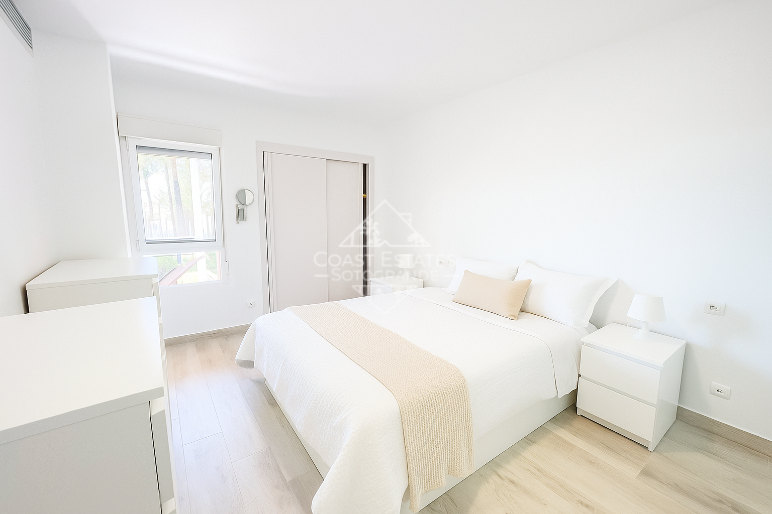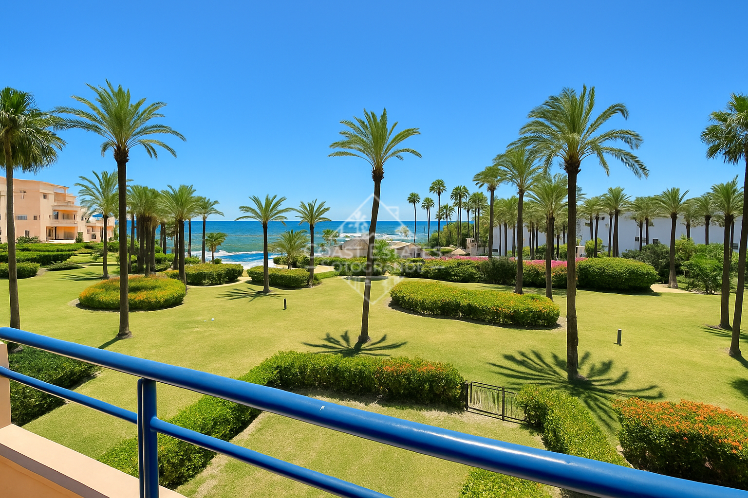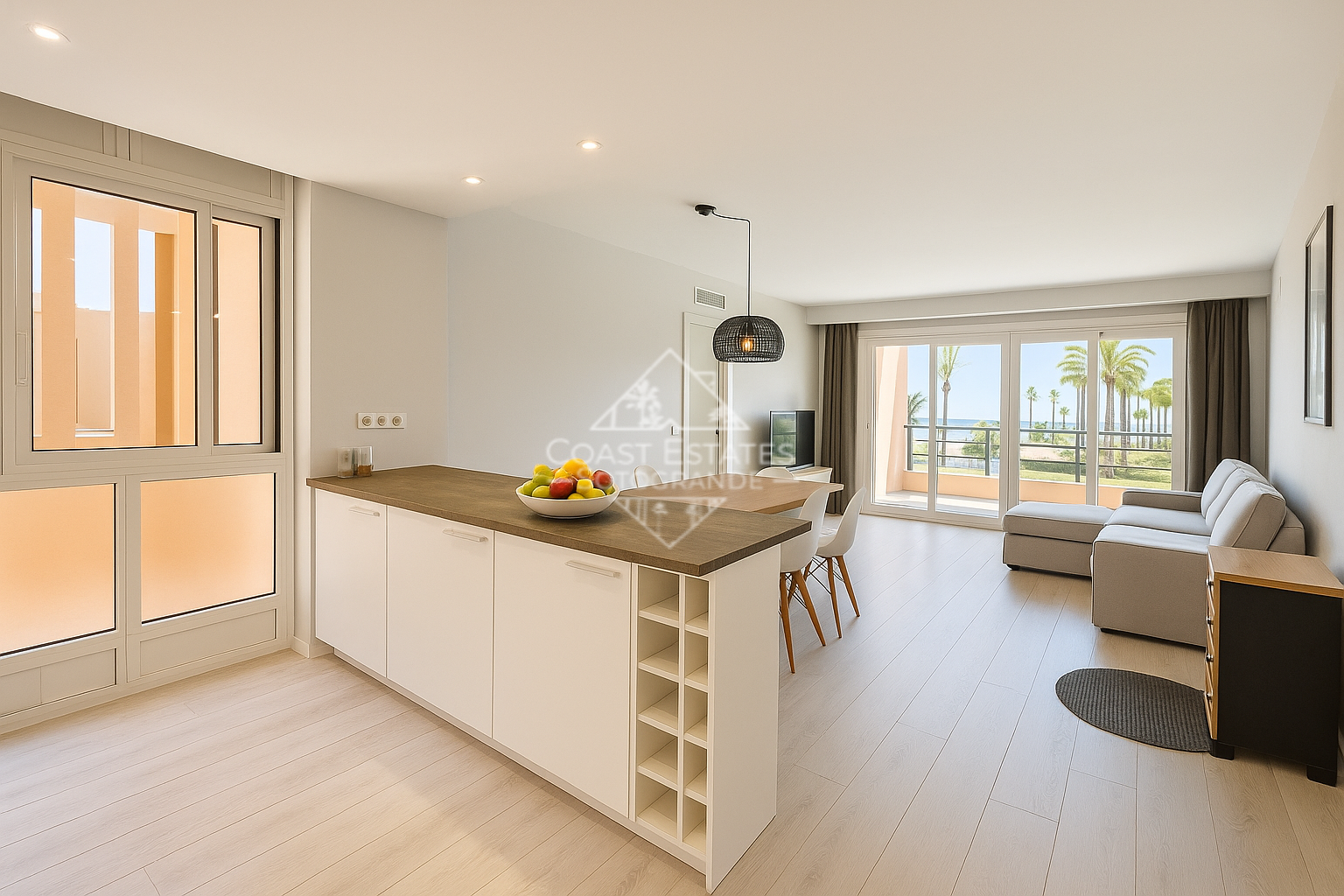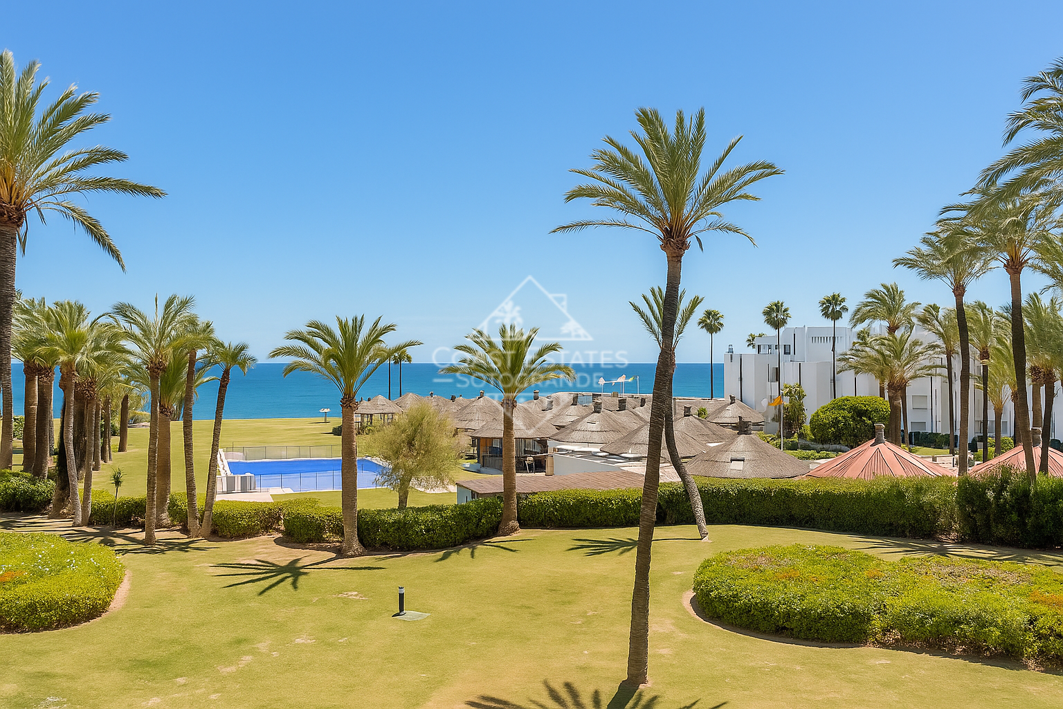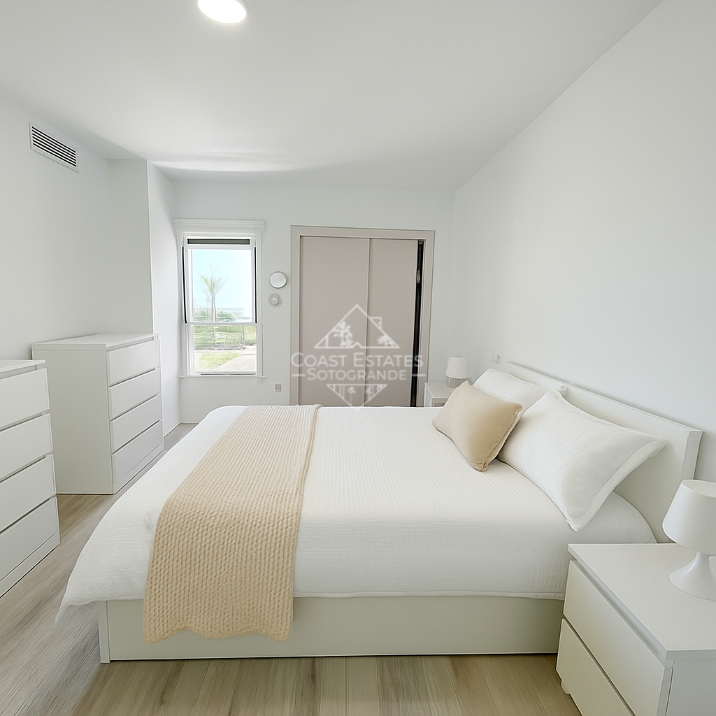 This charming recently renovated apartment is situated in one of the best locations in Sotogrande "Paseo del Mar" very close to the beach of Sotogrande. The apartment is on the second floor and comprises of a modern open plan fitted kitchen which opens onto the lounge and dining area, three bedrooms, and two bathrooms. The highlight of the apartment is the 12 m2 south-facing terrace with a dining area from where you can enjoy beautiful views over the communal gardens and the sea. The whole apartment has air conditioning. An underground parking space is included in the price.